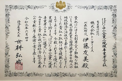 この度、「はばたく中小企業・小規模事業者300社」に選定され、令和元年6月4日、経済産業省にて表彰を受けました。
