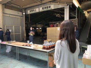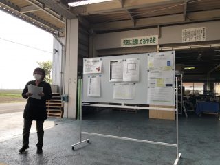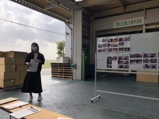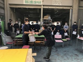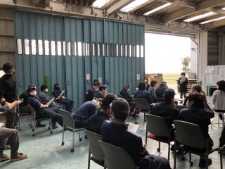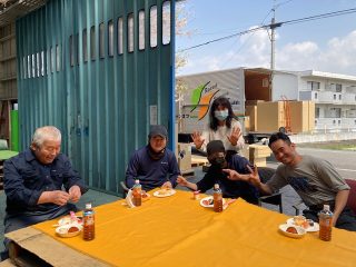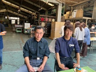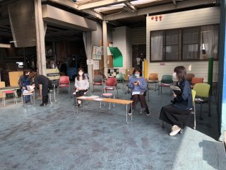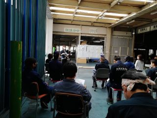 季節もいいですし、工場前の広場でイス並べて行いました。