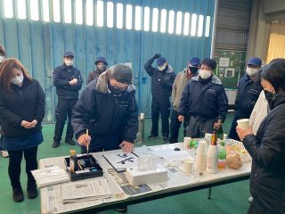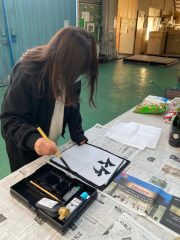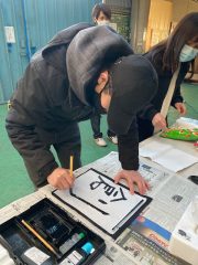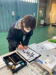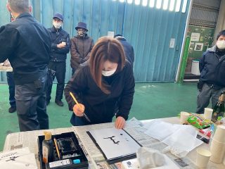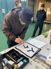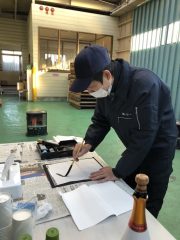 遅い時間に出社してきた人は、みんなに見守られながらの書初めです。
