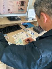 でっかい手で小さなシールをちまちま貼っています。