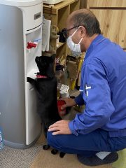 ウオーターサーバーのメンテナンスにも、もちろん立ち会います。(流れる水大好き)