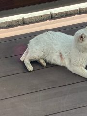 右側腹部に咬傷。出血(+)。いつもより元気のない感じがします・・・。