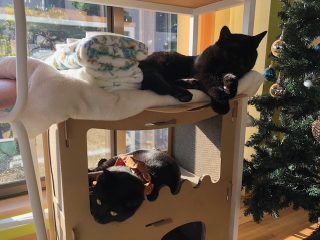タワーマンションで昼下がりを過ごす黒猫社員。