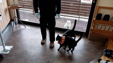 ベトナム人社員が事務所に来ると、群がる黒猫社員。
