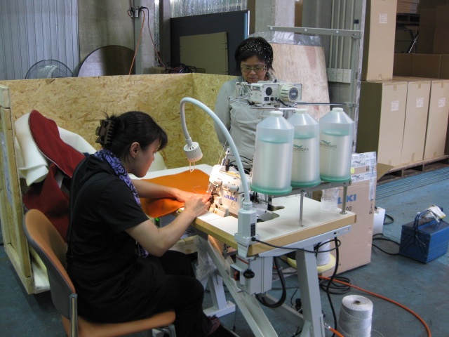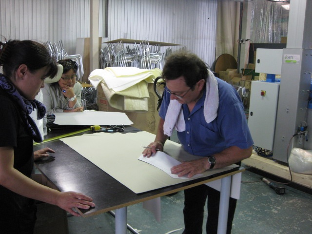 型紙の取り方、最新ミシンの使い方、張りの技術・・・。私にとっても、張り場担当者にとってもこうして本場の技術を目の当たりに学ぶのは初めてのことでした。