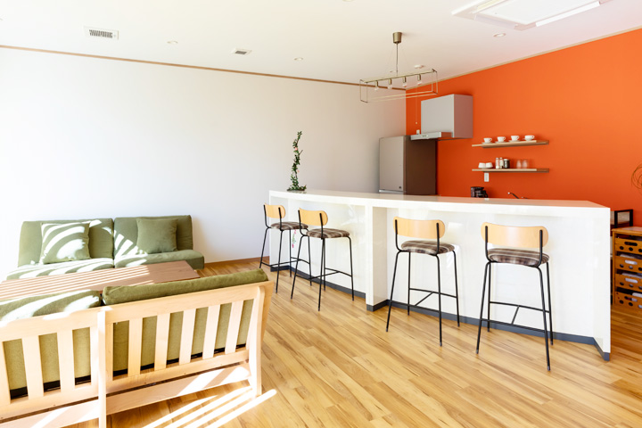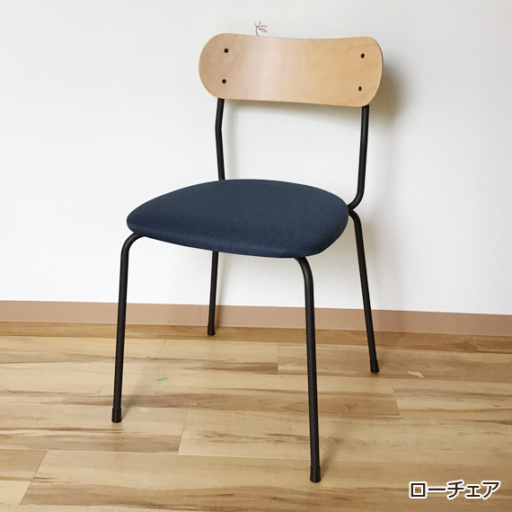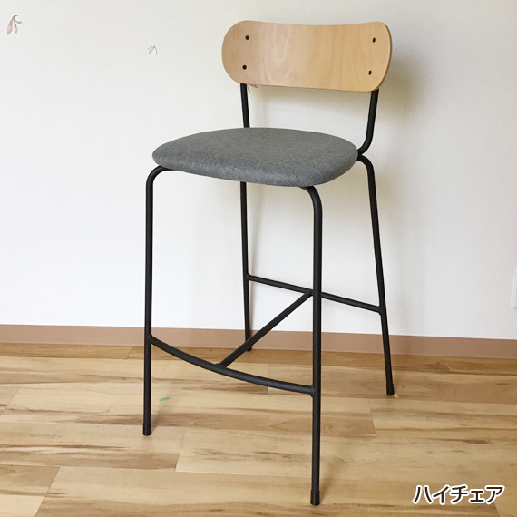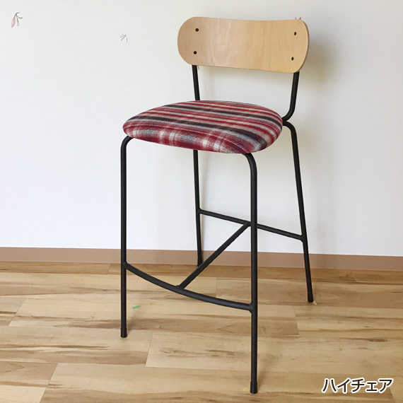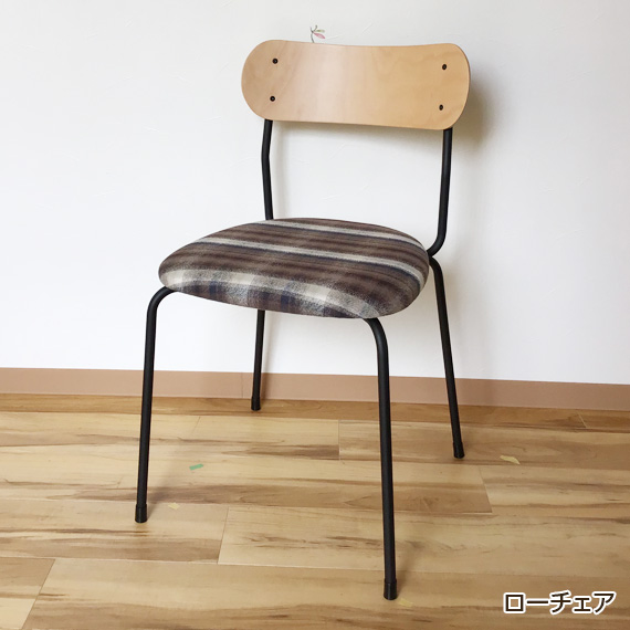 ロータイプとカウンタータイプの2種類。 背が木製品 座面がファブリックの為、あたたかいイメージのイス。