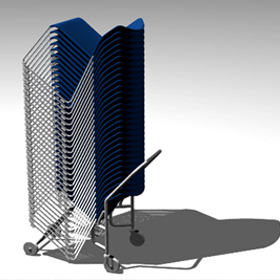 イスの積載移動用として専用ドーリーを設定をし、収納の際には簡単に移動でき、収納効率もUPすることができます。最大積載数は30脚です。※専用ドーリーは現在開発中です。