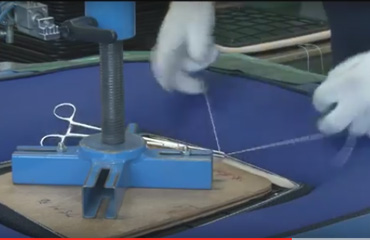 裁断した張地は、特殊ミシンでC-GEX糸を縫い込み、専用機で張り加工を行います。