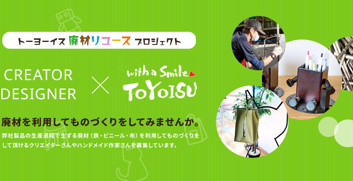 SDGs達成に向けてトーヨーイスでも何か出来ることはないかと考え、弊社製品の生産過程で生ずる廃材(鉄やビニールレザー、布)を再利用することで少しでも廃棄物を減らし環境問題に取り組めるのではないかと思い、この度「トーヨーイス廃材リユースプロジェクト」を行う事に至りました。