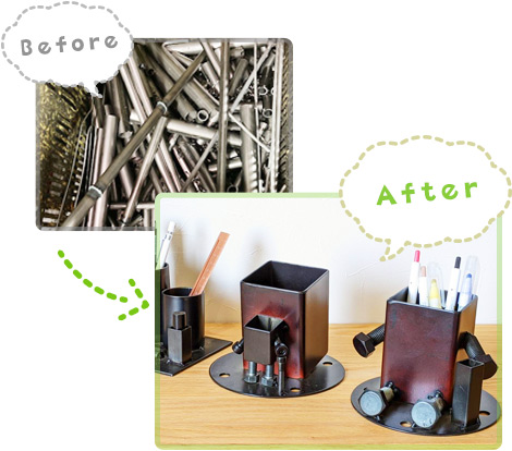 このプロジェクトのきっかけは以前よりイスの製造過程で毎日のようにでるパイプの廃材を利用して作ったペン立てを見て「これもSDGsじゃない?」と思ったのが始まりです。